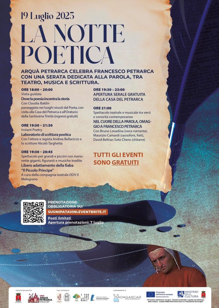 Arquà Petrarca, uno dei Borghi più belli d’Italia, celebra Francesco Petrarca – il Poeta dell’Amore assoluto – con una serata dedicata alla parola tra teatro, musica, scrittura, visite guidate, laboratori ed esperienze imperdibili.