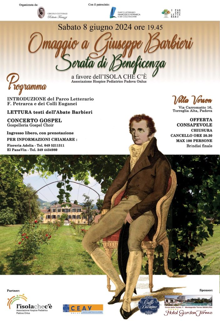 Sabato 8 giugno alle 19,45 la famiglia Verson, con il circolo Culturale Ferruzzi, il Parco Letterario Francesco Petrarca e i Parchi Letterari, ti invitano a partecipare alla serata di beneficenza presso villa Abate Barbieri Verson, in onore di Giuseppe Barbieri e in supporto dell’associazione L’ISOLA CHE C’È per l’Hospice Pediatrico di Padova.