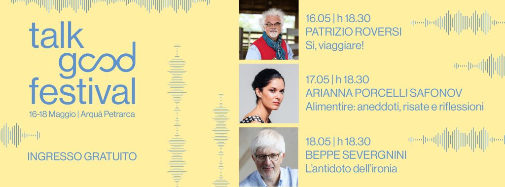 La prima edizione del Talk Good Festival si apre venerdì 16 maggio ad Arquà Petrarca con Patrizio Roversi, personaggio televisivo molto amato dal pubblico per le sue trasmissioni su viaggi, ambiente e gastronomia che dialogherà con il giornalista Ivan Grozny Compasso.