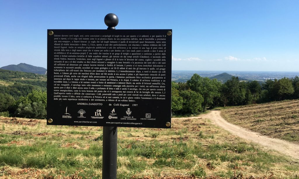 Esistono davvero certi luoghi, anzi, certe concrezioni o arcipelaghi di luoghi in cui, per quanto ci si addentri, e per quanto li si pensi e ripensi, o li si colga tutti insieme come in un plastico fissato da una prospettiva dall’alto, mai si riuscirebbe a precisarne una vera “mappa”, a fissarvi itinerari. La voglia che tali luoghi insinuano è quella di introiettarli quasi fisicamente, tanto sono vibranti di vitalità intrecciate e dense. […] Ecco, questo si può dire particolarmente, con sfacciata e maliosa evidenza dei Colli (monti) Euganei. Anche un semplice pieghevole pubblicitario è più che sufficiente a far entrare in una fuga di piani visivi, di vicende della terra e degli essere umani che vi stanno per scelta o per destino con i loro casali, paesi o castelli, a dare il senso di un “infinito” e di un “eterno” proprii. E’ una realtà che trascina in un gorgo di intrighi o apparizioni o conferme: a partire dalle vicine o incluse “astuzie” termiche di falde acquifere salutari, già cantate sin dai tempi antichi (Claudiano), e lasciando sullo sfondo Padova. Muoversi, formicolare, stare negli Euganei e glissare di là in tutte le direzioni del cosmo, cogliere i possibili della tortuosità di una o di dieci stradine su dieci diversi orizzonti e assaggiare la sana festosità e la pacatezza dei tanti olivi e dei tanti olii sufficienti ad alimentare per sempre lucerne interiori e fluidità di fantasie. E presto ci si trova invischiati dolcemente e acremente in successivi paradisi, accordati col corpo geologico e coi 30-35 milioni di anni che gli inarcano le spalle, col gregge indisciplinato dei colli-monti che finiscono per modularsi in labirinto. […] Immediatamente dopo, a nord si alzano sui colli Baone, e Calaone già corte dei marchesi d’Este dove nel XIII secolo si era acceso il primo e più importante cenacolo di poeti provenzali d’Italia, anche con rifugiati dalla persecuzione in patria. L’immenso patrimonio lirico occitanico giustamente si assestava qui dopo le tappe sicula e toscana, per trovare nel Petrarca, e in Arquà, il culmine di un’intera tradizione e un incredibile inizio. […] Intorno a lui ruotano eventi e frotte di ammiratori e imitatori illustri, ma anche di letterati ammuffiti. Ora, col suo rosagiallo, il sarcofago tante volte manomesso e restaurato campeggia nella piazzetta per i turisti, ma nell’inverno silente questa pare si dilati e dilati ancora entro il nulla; e profumato di brina e nulla è anche il sarcofago, che non per questo cesserà di essere smangiucchiato, come la testa bronzea del poeta che vi è sovrapposta mai cesserà di far da bersaglio alle sassate. […] Quell’aspetto romito e difficile che conservano i Colli, penetrabili solo a piedi per certi viottoli non asfaltati, dove è ancora possibile trovare il falco, certo si confaceva al Petrarca e ai suoi cammini, in cui è giusto vedere l’assommarsi e il divaricarsi delle più varie esperienze intellettive e del sentimento, a ridosso di un “ultimo limite”.